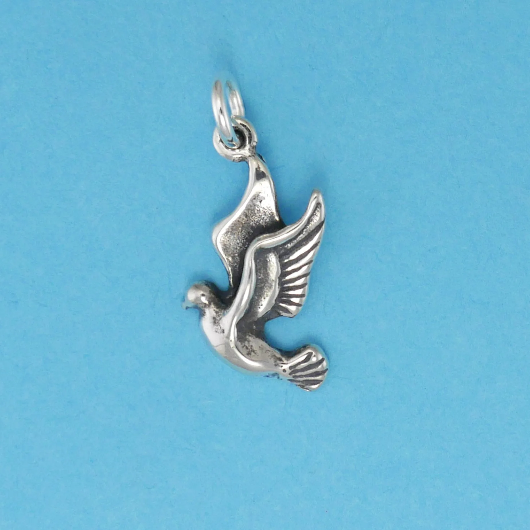 Our charm depicts a dove landing gracefully in a very flimsy and poorly built nest. The dove carries with it religious meaning as well as symbolizing peace. The size of this charm makes it perfect for your charm bracelet!