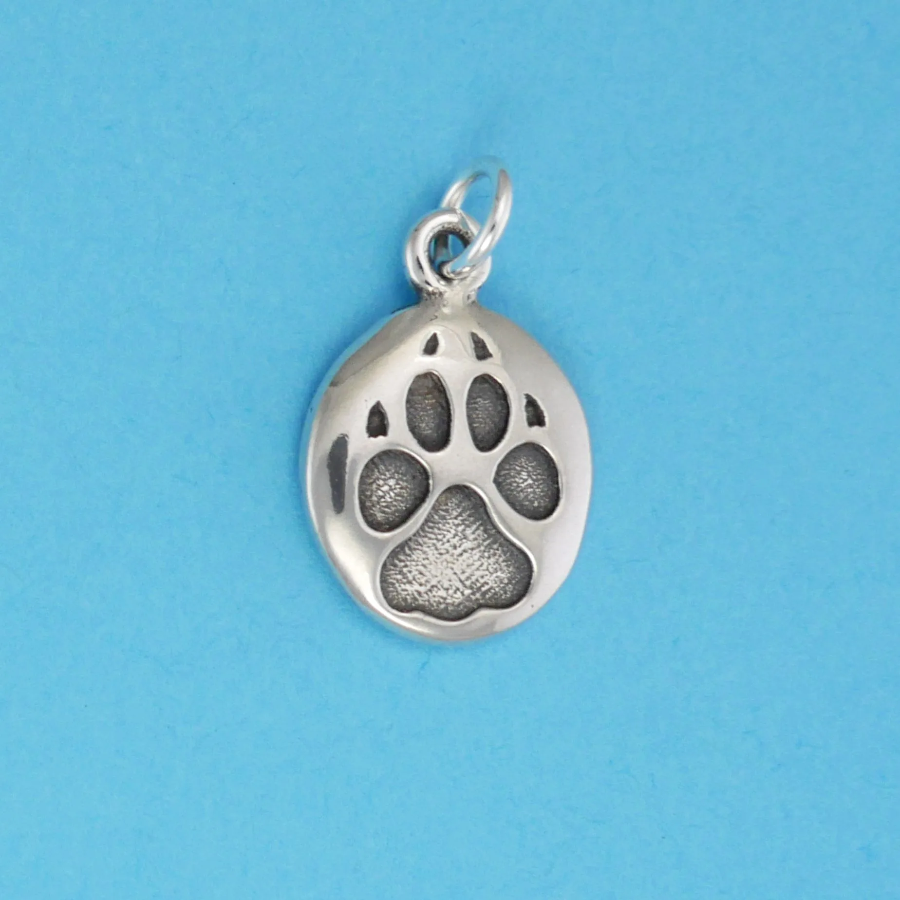 A dog paw print charm, perfect for the dog lover’s charm bracelet! Our charm is lozenge shaped with a flat textured back and we’re sure you’ll love it!