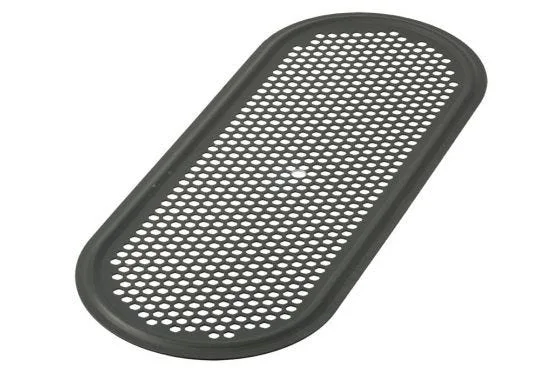 Pan for rounded flatbreads! The Rounded Corner Hex Pan has the most airflow due to the unique hexagonal shape of the perforation. This six-sided opening allows the holes to be positioned closely allowing the maximum exposure to the heat of the oven while still maintaining strength, 50% airflow to 50% surface ratio. This air flow makes for a quicker bake time and a nice brown color to your crust. Our unique raised beaded edge adds strength to the pan. Easy to use, clean and maintain makes this the perfect pan for rounded flatbreads! PSTK coating that is non-toxic, PTFE, permanent, won’t chip, peel or flake.