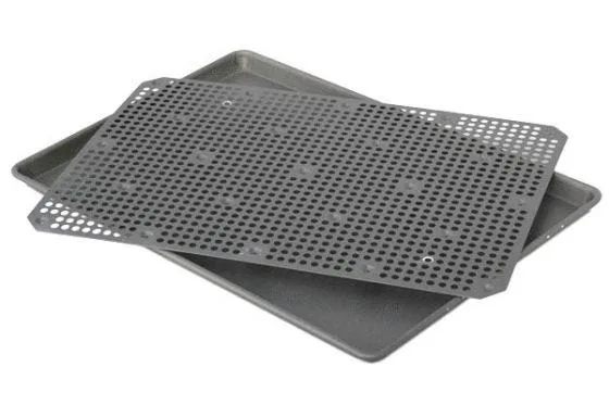 Half-sheet pan and perforated insert with nibs (or feet) gives baked foods extra crispiness and removes some of the fat from chicken wings, sliders, ribs and more! The innovative baking pan keeps foods high and dry instead of having them sit or stew in unwanted fats and oils. The results are impressive: crispier products and a cleaner oven!